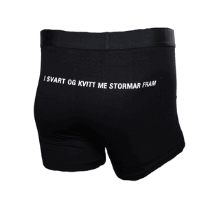 Denne svarte bokseren er trykt med Sogndal-logo og «STAO NO PAO» framme, og teksten «I KVITT OG SVART ME STORMAR FRAM» bak.
